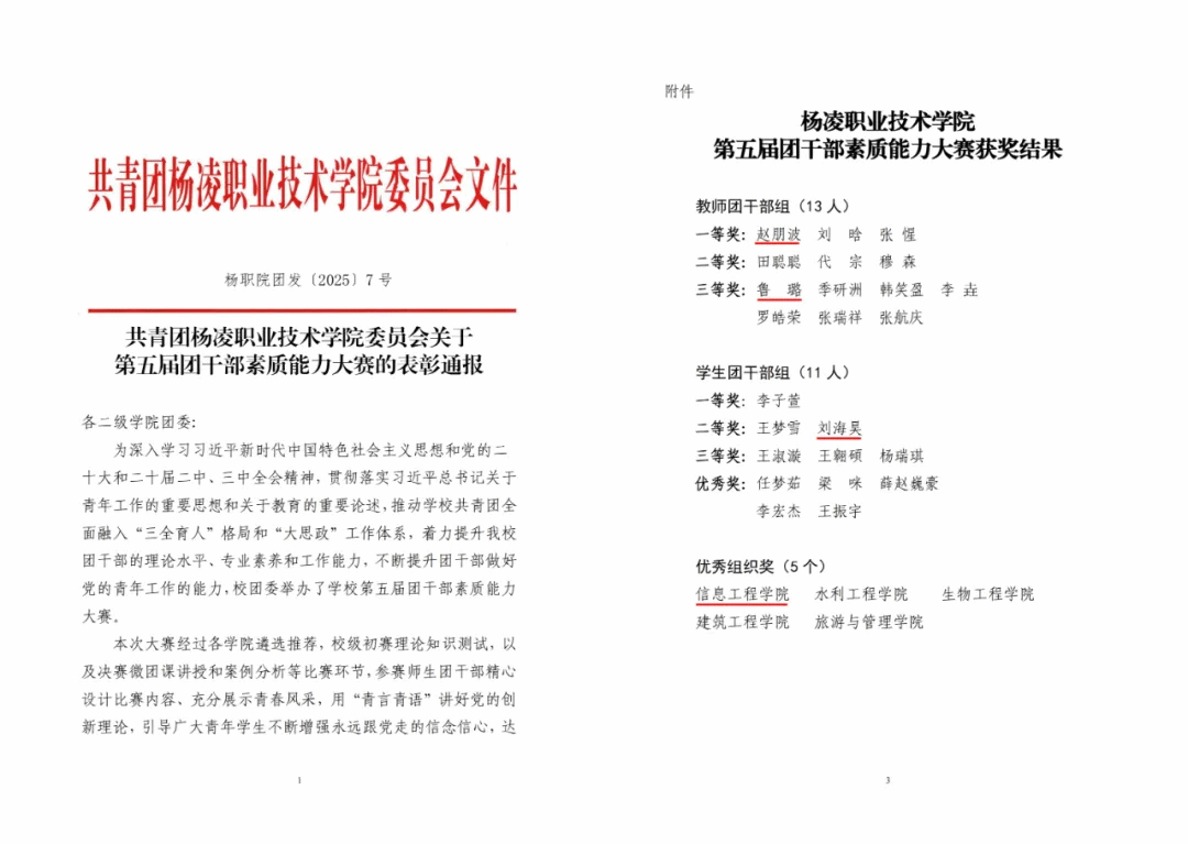 近日,学校第五届团干部素质能力大赛暨青春微团课示范展演活动在水韵楼二楼报告厅落下帷幕。经过激烈角逐,我院教师团干部赵朋波获得一等奖、鲁璐获得三等奖,学生团干部刘海昊获得二等奖。我院获得“优秀组织奖”。