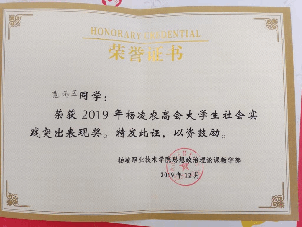 2020年6月 荣获杨凌职业技术学院颁发的“党课结业证书”;