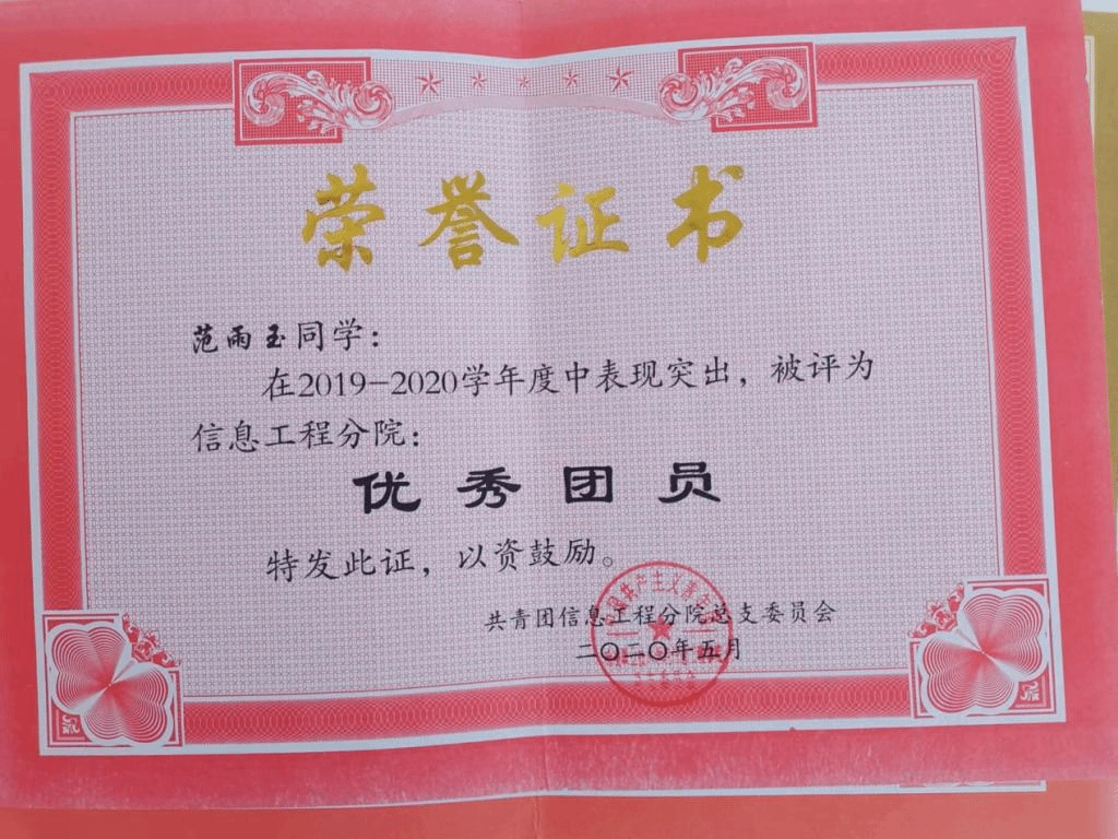 在2020-2021学年度表现突出,成绩优异被评为优秀共青团员。