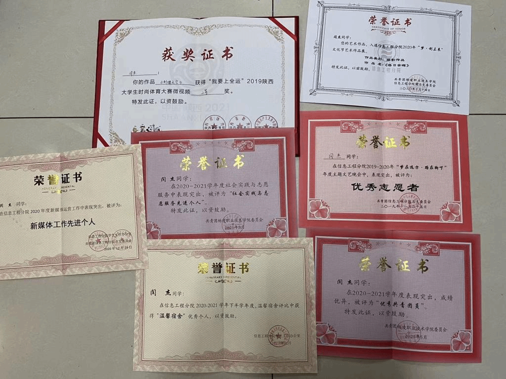 在校情况:在校期间我积极参加各类活动,认真学习专业课知识,丰富自己的业余生活。在2020年12月获得信息工程分院2019级三好学生。在2021年5月杨凌职业技术学院弟二十一届学生技能技赛5G全网建设技术个人赛中荣获二等奖。在2020—2021学年共青团工作中表突出被评为优秀共青团员。