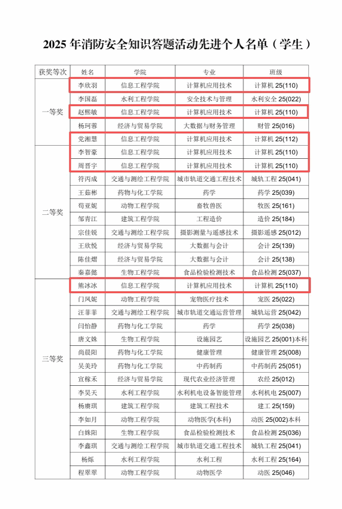 经答题成绩与用时综合评定,我院李欣羽、赵熙敏、党湘慧获一等奖,李智豪、周晋宇获二等奖,熊冰冰获三等奖(名单附下)。成绩不仅彰显了信工学子的知识储备,更体现了学院安全宣教的实施成果。获奖学生表示将珍惜荣誉,持续学习传播消防知识,将消防内容融入教学。