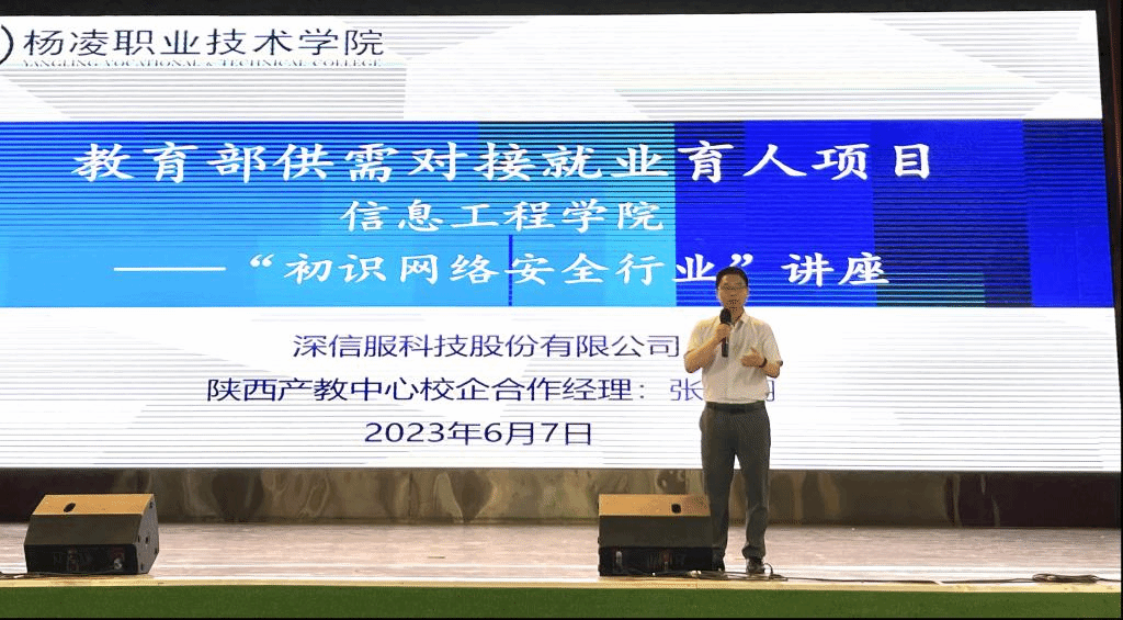 为帮助2024届计算机应用技术专业的同学们更快了解市场发展动态、提前了解企业人才需求,为以后的工作打好坚实的基础。2023年6月7日,信息工程学院特邀深信服科技有限公司校企合作经理张湛翔、深信服陕西区产教融合总监彭文凯、深信服陕西区教育行业总监马超为信息工程学院2021级计算机应用技术专业学生开展“初识网络安全行业”专业讲座。信息工程学院副院长熊刚;教师任朝晖、杨雪菲、汝春瑞;就业专干王昊宇以及2021级计算机应用技术专业的全体学生出席此次讲座。