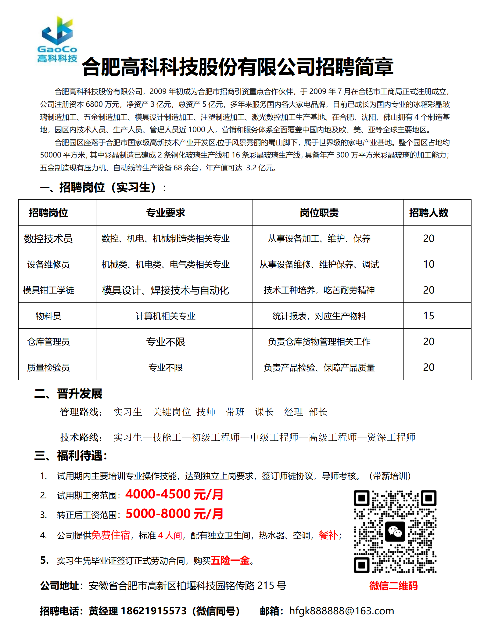 【招聘信息】合肥高科科技股份有限公司招聘简章