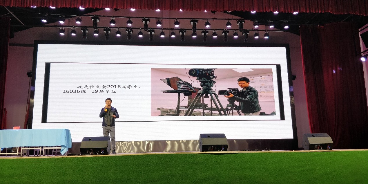 我院动漫制作技术专业2019届毕业生杜文勃做“一个平凡的人——个人成长经历分享”主题讲座。结合个人在西安创业的经历,与新生分享了面向影视制作等方面的工作、生活点点滴滴的个人故事。