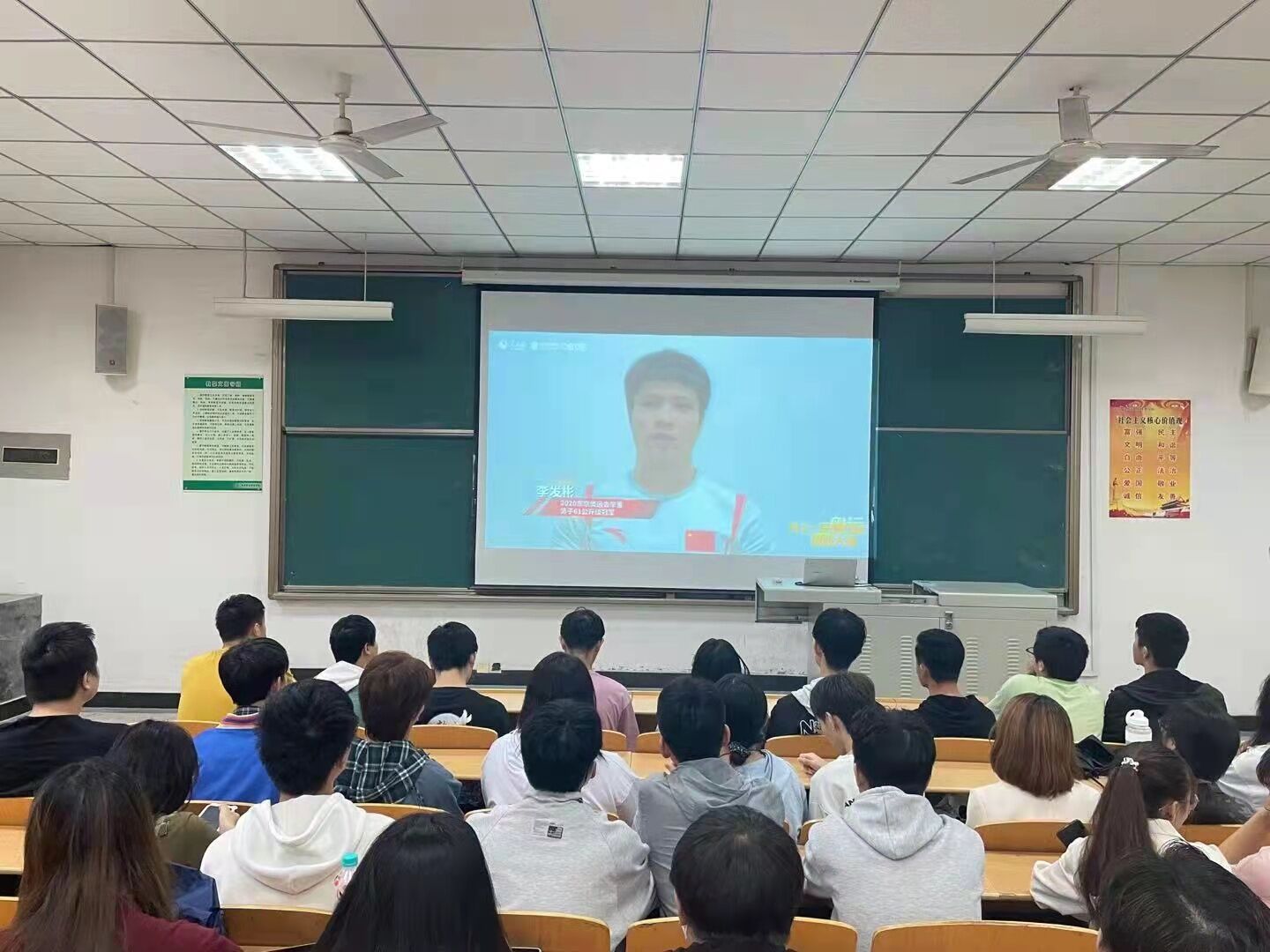 为深入贯彻落实习近平总书记关于深化思想政治理论课改革创新和“大思政课”的重要指示批示精神,让广大师生领悟赛场上中国奥运健儿们身上永远向上、奋斗拼搏的精神风貌与奥运品格,推动“大思政课”建设与冠军精神深度融合,建设良好学风。2021年9月25日下午,信息工程学院组织全体师生采用教室集中收看学习与宿舍、家庭分散收看学习相结合的方式,共同收看了“同上一堂奥运思政大课”线上直播。信息工程学院全体教职工共63人、学生2400多人观看了直播。