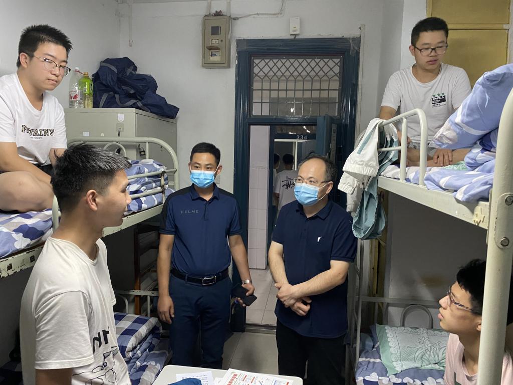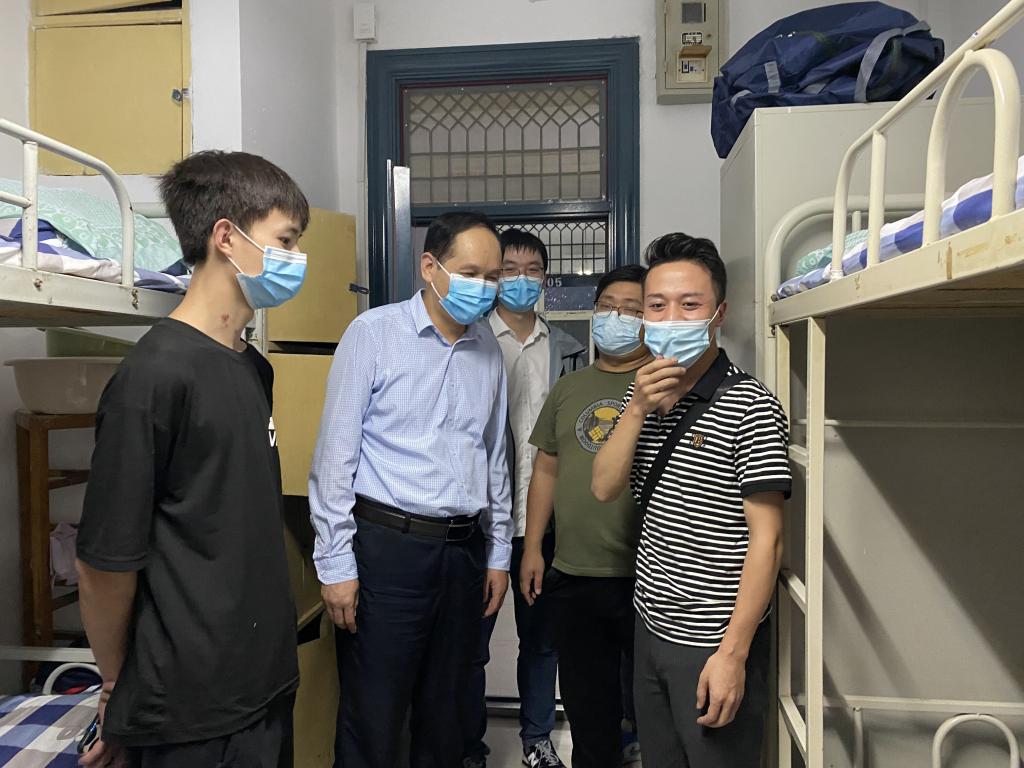 2021年9月4日19:00,信息工程学院党总支副书记吴高潮、副院长陈高锋、院办主任王巍、学工办主任任争峰等学院领导及辅导员张齐、王茜等,深入北校区302、303、304学生公寓看望2021级新生。