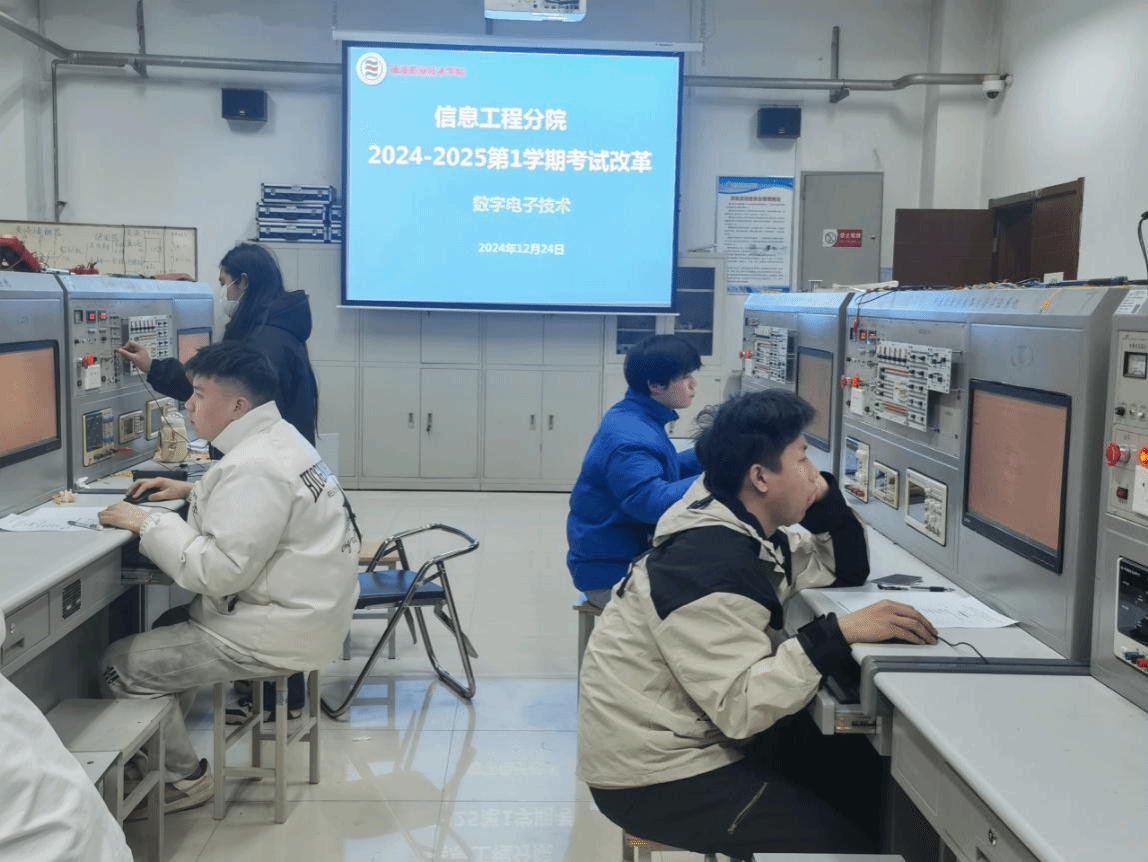 2024年12月24日-25日,2023级应用电子技术专业电子23(039)班和电子23(040)班在醒钟楼NOD625数字电子技术实训室完成了本学期考试改革课程《数字电子技术》的考核。