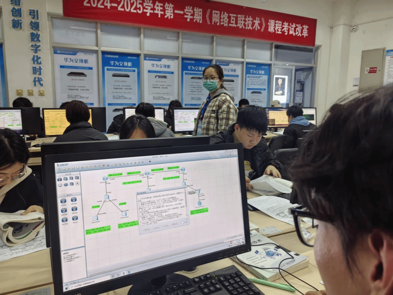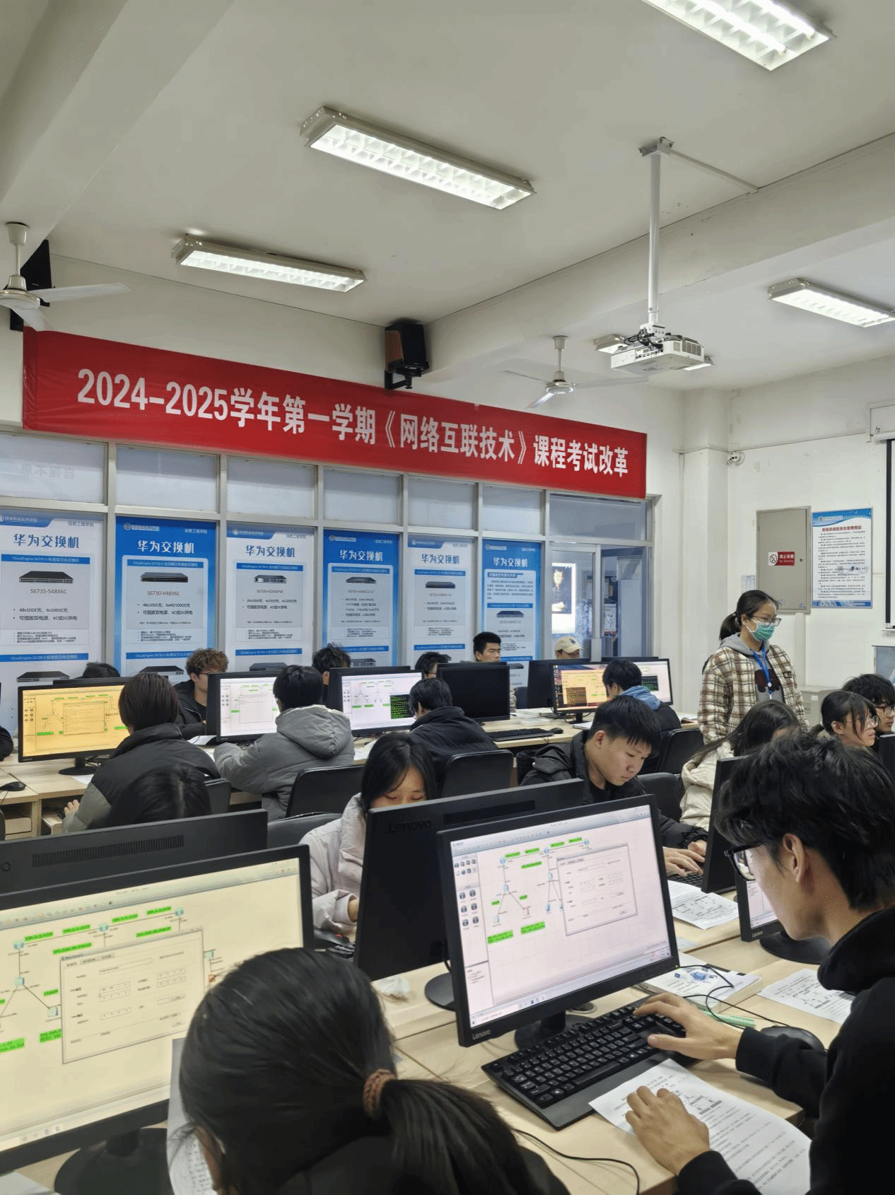 为适应信息技术的快速发展和网络工程领域对人才能力的新要求,有效推动课程建设和教学质量,2024年12月23日至25日,计算机应用技术专业9个班的学生在南校区醒钟楼NOD529、NOD604、NOD609实训室完成了《网络互联技术》课程改革考试。
