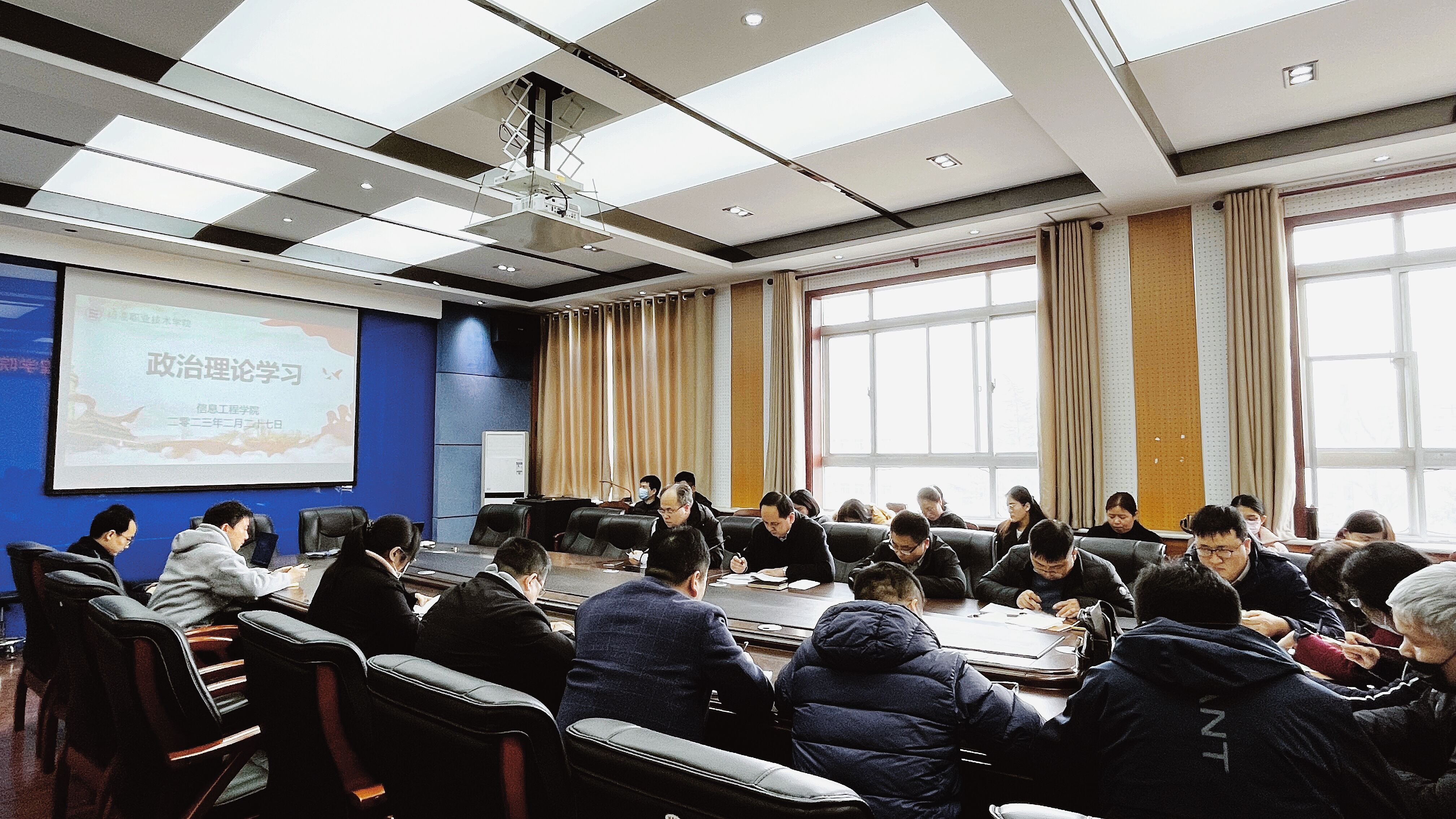 为学习贯彻党的二十大精神,进一步增强理论素养,按照学院党总支政治理论学习计划安排,2月27日下午,信息工程学院组织全体教职工在秦风楼4楼会议室开展政治理论学习。