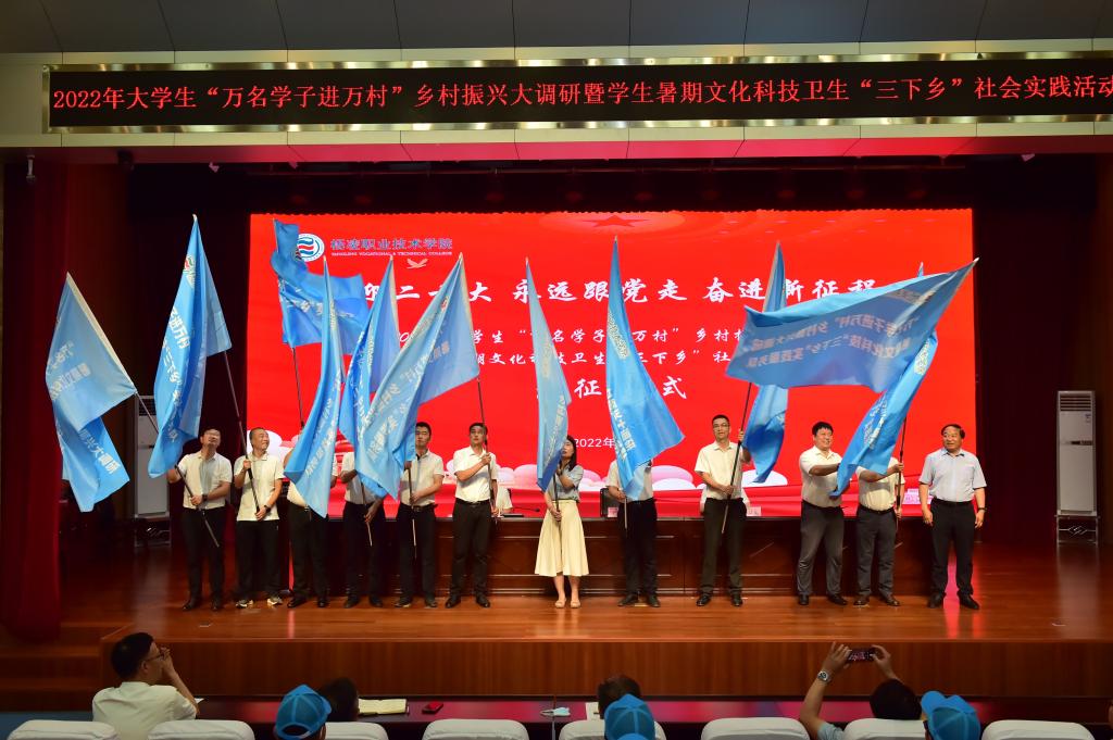 7月6日下午,学校2022年大学生“万名学子进万村”乡村振兴大调研暨暑期“三下乡”社会实践活动启动仪式在南校区思辨堂举行。校长王周锁为社会实践团队授旗,党委副书记任得元主持启动仪式,党委副书记、纪委书记王勇胜作动员讲话。