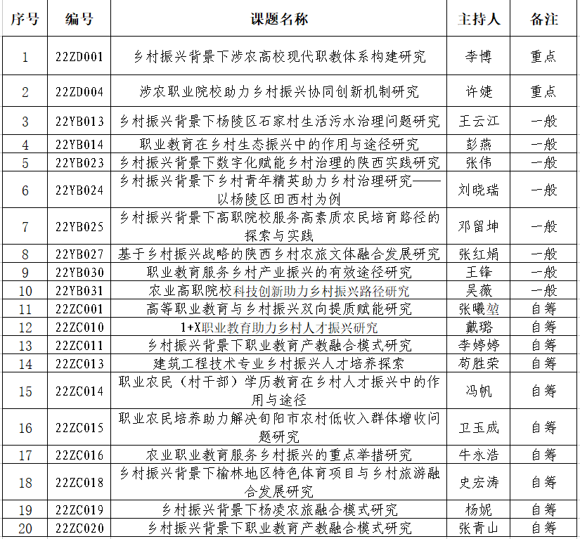 近日,陕西职业教育乡村振兴研究院公布2022年度研究课题立项结果,20项课题获批,其中重点课题2项一般课题8项、自筹课题10项。