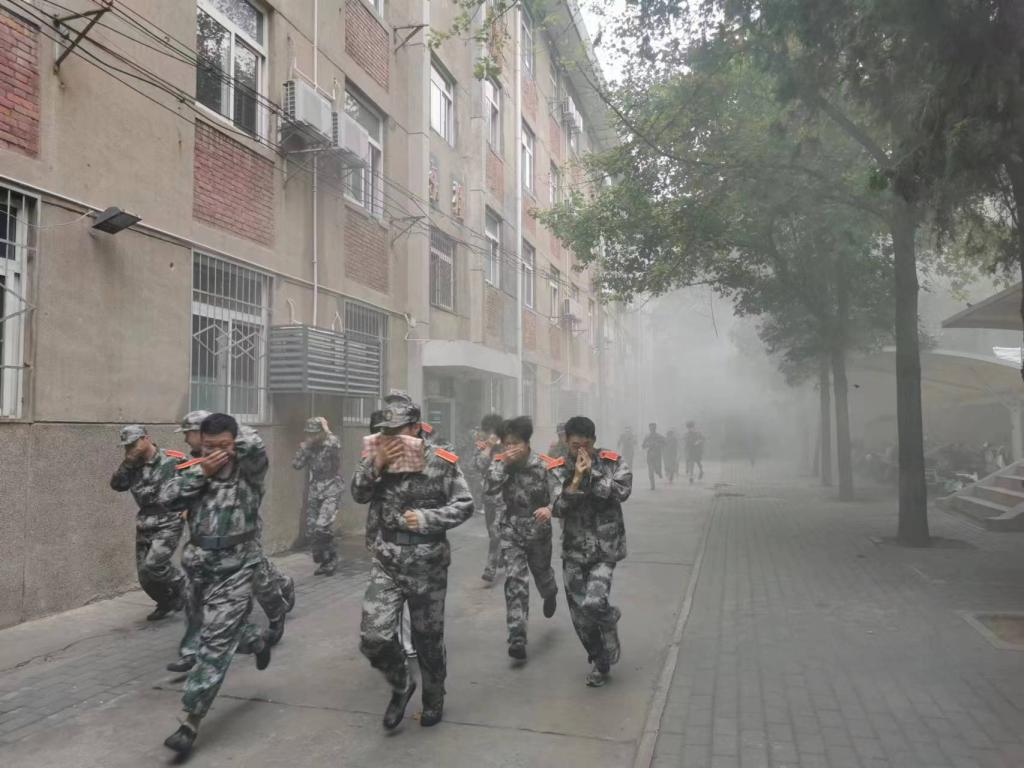 为增强火灾场景真实性,深度提升学生参与感,本次演练于学生公寓楼内进行。此次演练,各部门做好充分准备,对相关工作人员、引导员进行培训,在各楼仿真火灾点施放烟雾,鸣哨示警。启动疏散流程后,各区域工作人员引导学生使用湿毛巾捂住口鼻,弯腰低姿态沿疏散标识所示方向有序完成疏散,在指定区域集合点评。