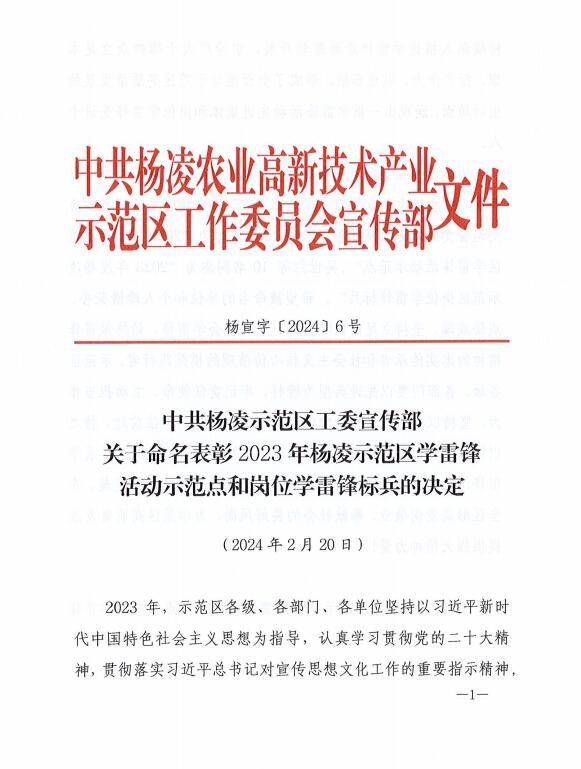 2月20日,杨凌示范区公布了2023年杨凌示范区学雷锋活动示范点和岗位学雷锋标兵名单,学校生物工程学院、动物工程学院获评“学雷锋活动示范点”,教师任杰、刘博荣获“岗位学雷锋标兵”称号。
