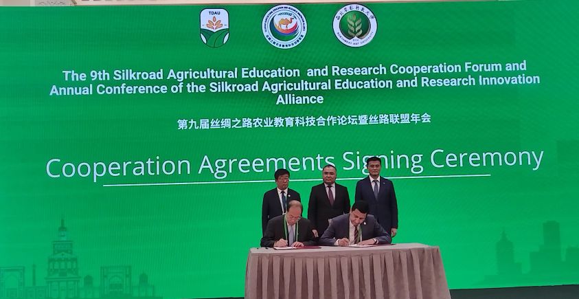 论坛期间,我校作为国内外唯一的高职院校成功加入丝绸之路农业教育科技合作论坛暨丝路联盟。仲伟周代表学校接受联盟对我校作为新成员单位的授牌,在乌兹别克斯坦农业部部长阿卜杜·拉赫莫诺夫、中国驻乌兹别克斯坦大使于骏和联盟秘书长吴普特的见签下,与塔什干国立农业大学签订了“专业技术培训项目合作协议”,并作了题为“职业教育赋能丝路农业科技高质量发展”的报告,受到国内外参会院校和单位的高度评价。