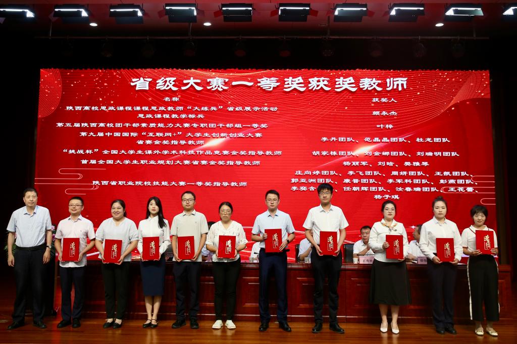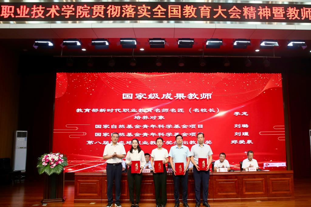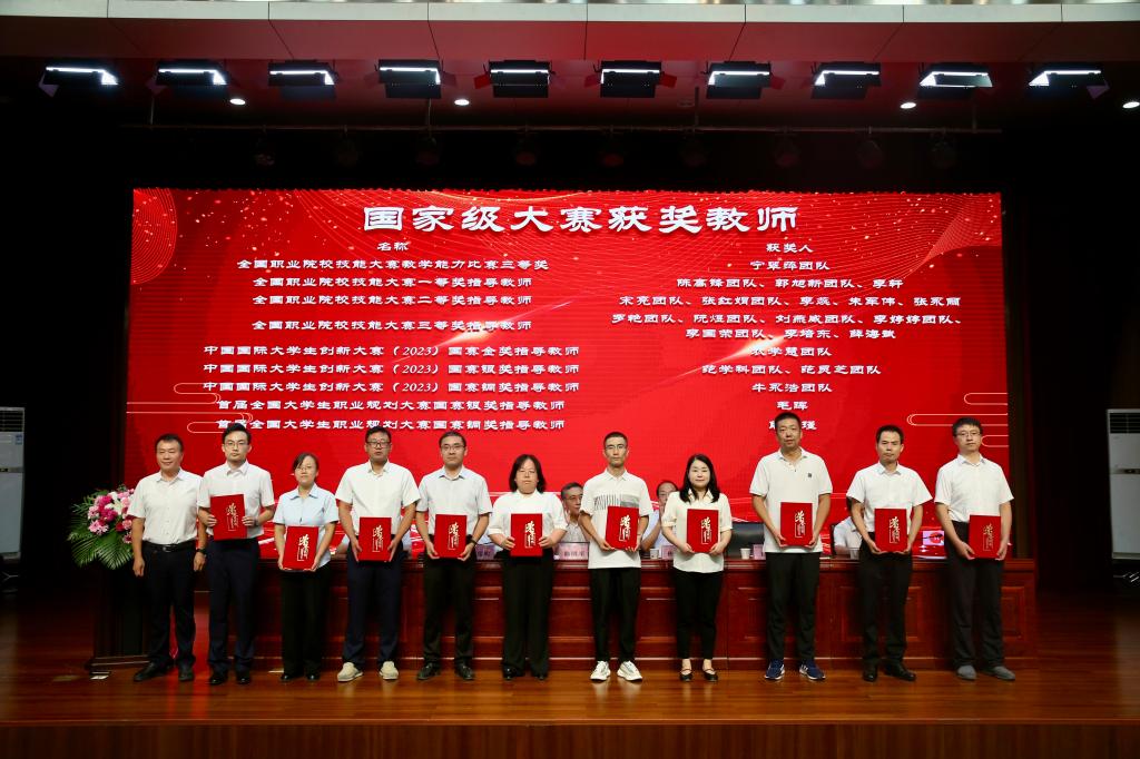 颁奖仪式上,韩明军为光荣从教30年教师颁发荣誉证书和纪念章,为获国家级成果教师颁发荣誉证书。刘瑞明为获省级荣誉、成果教师颁发荣誉证书。王勇胜为国家级大赛获奖教师代表颁发荣誉证书。祝战斌为省级大赛一等奖获奖教师代表颁发荣誉证书。胡俊鹏为省级课程建设获奖教师代表颁发荣誉证书。