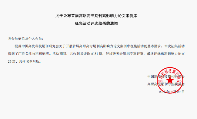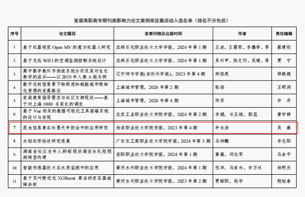 9月29日,中国高校科技期刊研究会先后公布了2025年度专项基金项目立项评审结果和首届高职高专期刊高影响力论文案例库征集评选结果。我校学报编辑部吴薇副研究员主持申报的《“新双高”背景下高职院校学报高质量发展路径研究与探索》课题,经多轮筛选,从76项申报项目中脱颖而出,获批高职高专期刊专项基金资助项目。由牛永浩等人撰写的《昆虫信息素在松墨天牛防治中的应用研究》一文,刊载于2024年第3期《杨凌职业技术学院学报》,从全国参选的81篇论文中脱颖而出,成功入选首届高职高专期刊高影响力论文案例库。