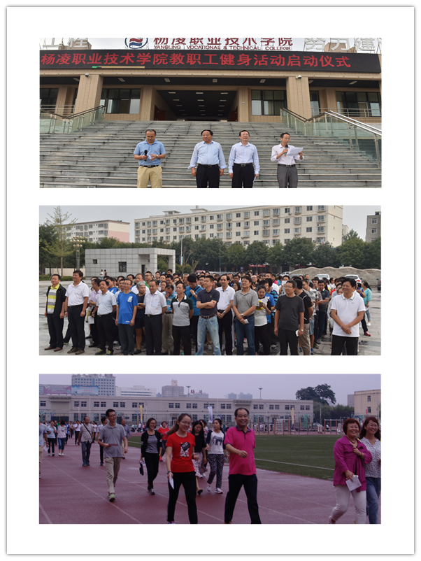 9 12 下午,我院教职工健身活动启动仪式在南校区操场举行。院长王周锁、党委副书记任得元出席,各基层工会主席,南校区各处室、各分院全体教职工共200余人参加了启动仪式。