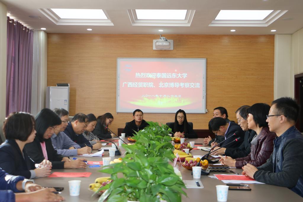 10月25日下午,泰国清迈远东大学校长教务特别助理、文学院院长 Pornnipa Channoi女士,广西财经职业技术学院副院长林震,北京博导前程信息技术股份有限公司副总裁陈栋等一行17人来我院考察交流。学院纪委书记刘粉莲接待了考察团一行。