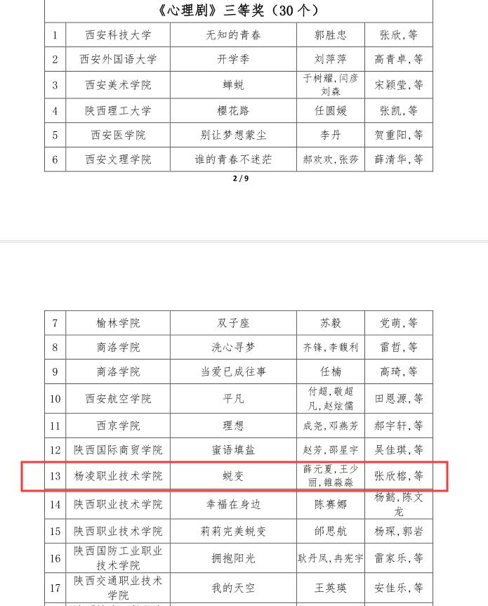 12月11日, 陕西省高校心理素质教育研究会发布《关于表彰第四届陕西省高校心理育人百家慕课学生作品获奖优秀成果的通报》我院参赛心理情景剧《蜕变》荣获三等奖。