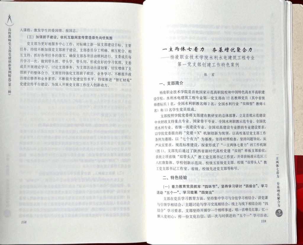 近日,由全国党员教育培训示范基地、华中师范大学培训中心组织编撰的《高校教师党支部党建创新案例精选》(第辑),经华中师范大学出版社正式出版全国发行。学校水利工程学院《“一主两体七着力,夯基增优聚合力”——一杨凌职业技术学院水利水电建筑工程专业第一党支部创建工作特色案例》成功入选。