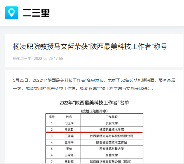 5月25日,2022年“陕西最美科技工作者”名单发布,表彰了52名长期扎根陕西,服务基层一线,成绩突出的优秀科技工作者。杨凌职院生物工程学院马文哲获此称号。