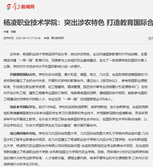 【群众新闻网】杨凌职业技术学院:突出涉农特色 打造教育国际合作知名品牌