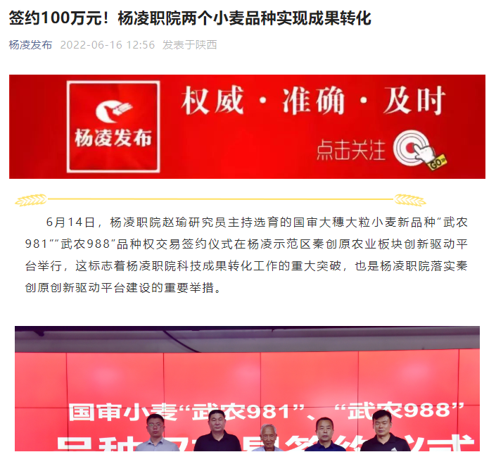 6月14日,杨凌职院赵瑜研究员主持选育的国审大穗大粒小麦新品种“武农981”“武农988”品种权交易签约仪式在杨凌示范区秦创原农业板块创新驱动平台举行,这标志着杨凌职院科技成果转化工作的重大突破,也是杨凌职院落实秦创原创新驱动平台建设的重要举措。
