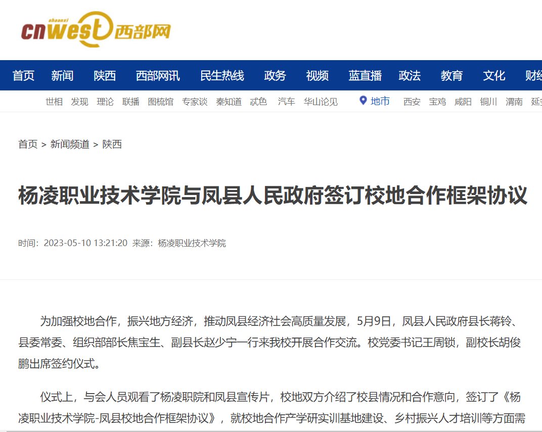 【西部网】杨凌职业技术学院与凤县人民政府签订校地合作框架协议