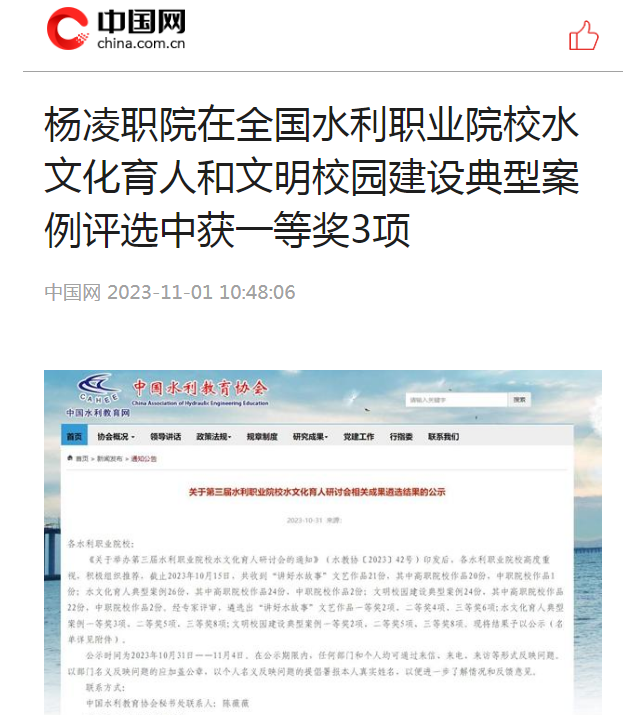 10月31日,中国水利教育协会公布了第三届水利职业院校水文化育人研讨会相关成果评选结果。由杨凌职业技术学院水利工程学院报送的《构建三秦水文化族谱,助力西部地区水利人才培养的螺旋实践》和《我和班主任共学水文化:打造水文化特色高职名班主任工作室的探索实践》2个案例获水文化育人典型案例一等奖;党委宣传部报送的《挖掘后稷文化 传承千年文脉 打造杨职特色文明校园品牌》案例获文明校园建设典型案例一等奖。