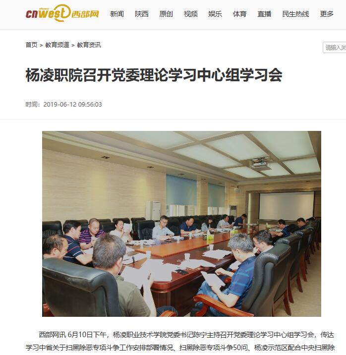 西部网讯 6月10日下午,杨凌职业技术学院党委书记陈宁主持召开党委理论学习中心组学习会,传达学习中省关于扫黑除恶专项斗争工作安排部署情况、扫黑除恶专项斗争50问、杨凌示范区配合中央扫黑除恶督导工作方案、中央督导杨凌示范区扫黑除恶工作任务清单,以及中省“不忘初心、牢记使命”主题教育工作会议精神、《陕西省高校意识形态工作责任制实施细则》和全国深化职业教育改革电视电话会议精神。党委中心组成员及各部门主要负责人参加学习会。