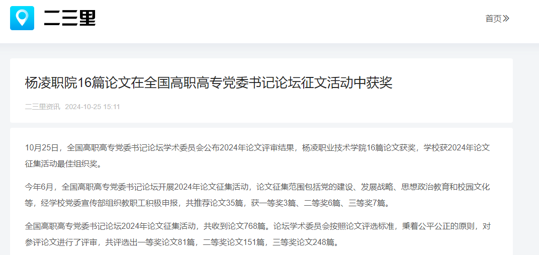 10月25日,全国高职高专党委书记论坛学术委员会公布2024年论文评审结果,杨凌职业技术学院16篇论文获奖,学校获2024年论文征集活动最佳组织奖。