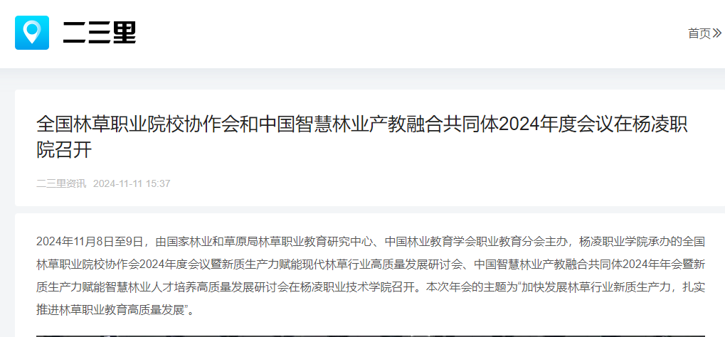 2024年11月8日至9日,由国家林业和草原局林草职业教育研究中心、中国林业教育学会职业教育分会主办,杨凌职业学院承办的全国林草职业院校协作会2024年度会议暨新质生产力赋能现代林草行业高质量发展研讨会、中国智慧林业产教融合共同体2024年年会暨新质生产力赋能智慧林业人才培养高质量发展研讨会在杨凌职业技术学院召开。本次年会的主题为“加快发展林草行业新质生产力,扎实推进林草职业教育高质量发展”。