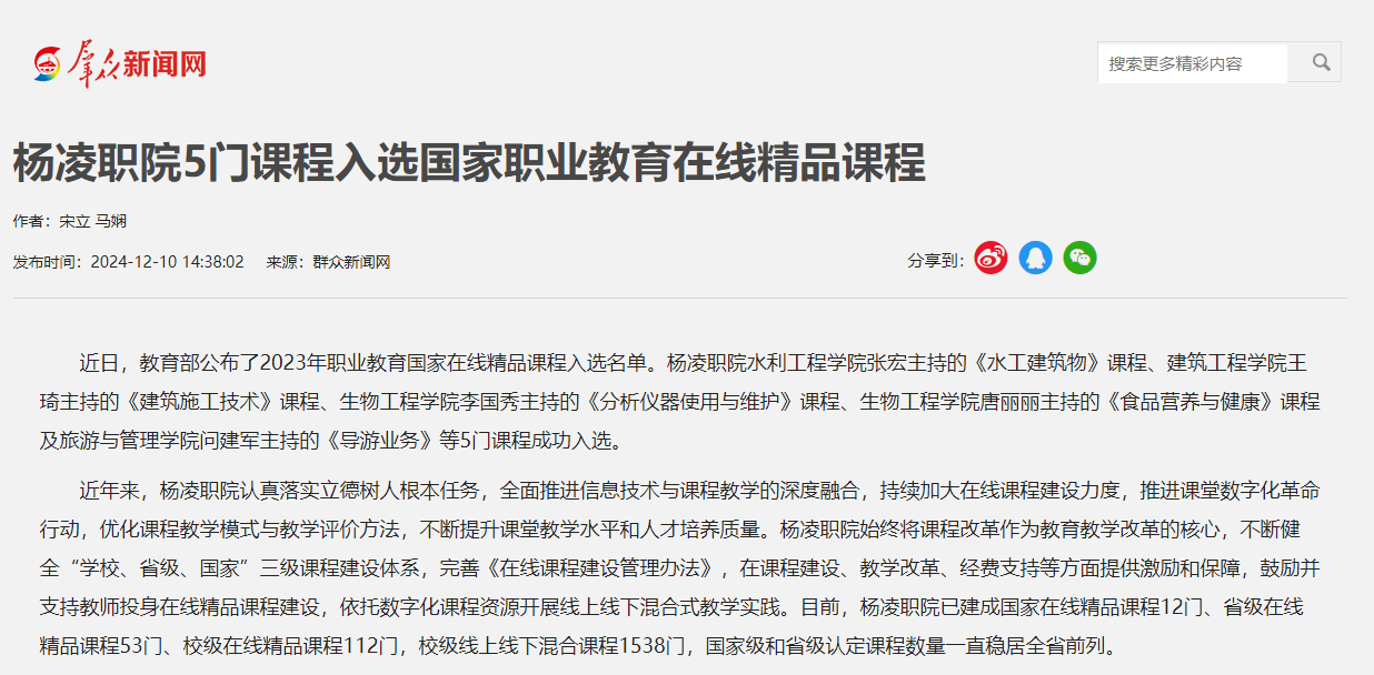 【群众新闻网】杨凌职院5门课程入选国家职业教育在线精品课程