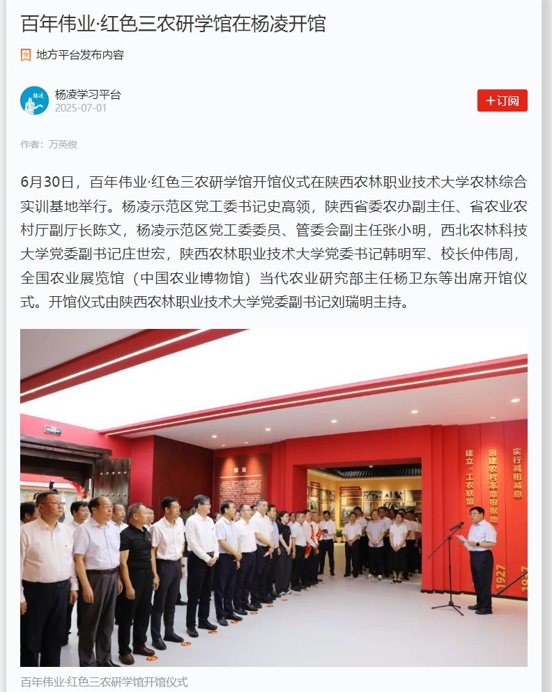 记者了解到,建设百年伟业·红色三农研学馆是陕西农林职业技术大学深入学习贯彻习近平总书记关于“三农”工作的重要论述,创新作为勇挑“三农”人才培养使命重担的重要体现。下一步,学校将以研学馆为平台,教育引导广大师生和党员干部深入了解中国共产党解决“三农”问题的光辉历程,从中厚植“三农”情怀,守牢职教报国初心,勇挑强农兴农重担,汲取智慧,凝聚力量,坚定信心决心,积极投身乡村振兴实践,助力农业农村现代化,为农业高质高效、乡村宜居宜业、农民富裕富足作出新的贡献。