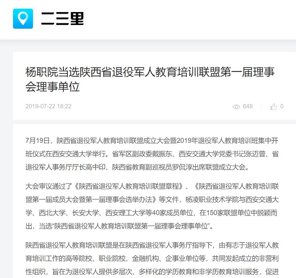会审议通过了《陕西省退役军人教育培训联盟章程》《陕西省退役军人教育培训联盟第一届成员大会暨第一届理事会选举办法等文件,杨凌职业技术学院西安交通大学、西北大学、长安大学、西安理工大学40家成员单位,在150家联盟单位中脱颖而出,当选“陕西省退役军人教育培训联盟第一届理事会理事单位”。