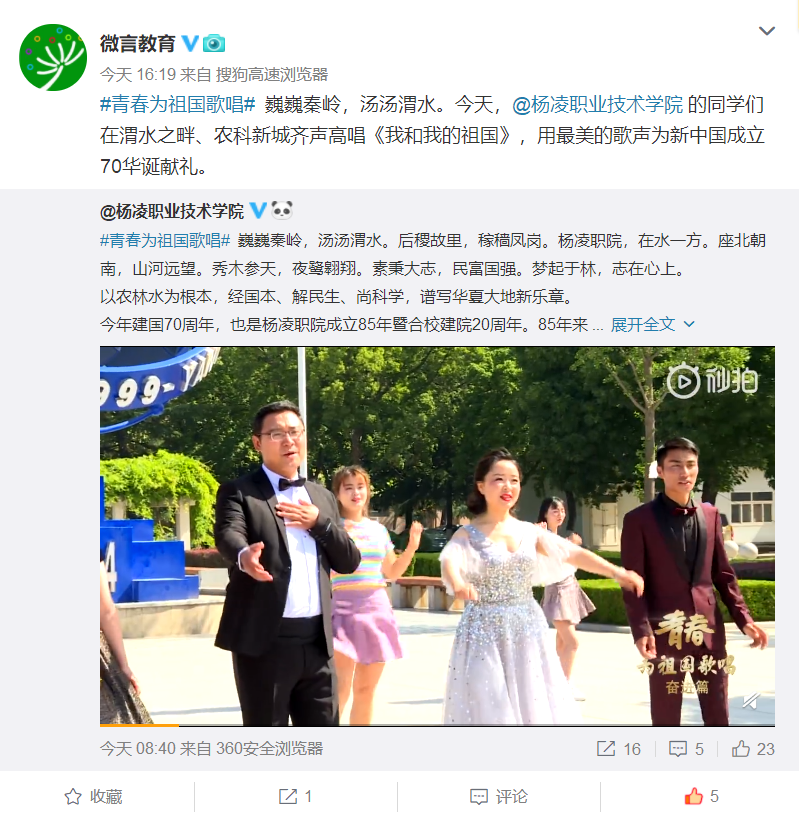陕西省人民政府门户网站官方微博微言教育转发我院“青春为祖国歌唱”拉歌视频微博。