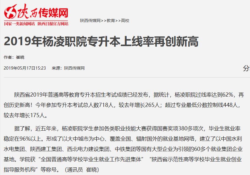 陕西省2019年普通高等教育专升本招生考试成绩已经发布,据统计,杨凌职院过线率达到62%,再创历史新高!今年参加专升本考试总人数718人,较去年增长265人;超过专业最低分数控制线448人,较去年增长175人。