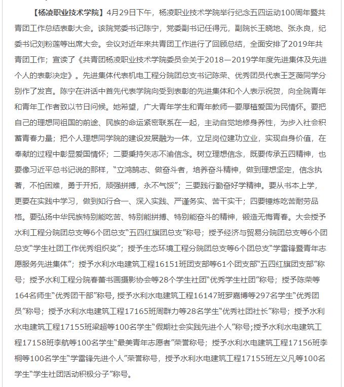 【杨凌职业技术学院】4月29日下午,杨凌职业技术学院举行纪念五四运动100周年暨共青团工作总结表彰大会。该院党委书记陈宁,党委副书记任得元,副院长王晓地、张永良,纪委书记刘粉莲等出席大会。会议对近年来共青团工作进行了回顾总结,全面安排了2019年共青团工作;宣读了《共青团杨凌职业技术学院委员会关于2018—2019学年度先进集体及先进个人的表彰决定》。先进集体代表机电工程分院团总支书记陈荣、优秀团员代表王芝薇同学分别作了发言。陈宁在讲话中首先代表学院向受到表彰的先进集体和个人表示祝贺,向全院青年和青年工作者致以节日问候。她希望,广大青年学生和青年教师一要厚植爱国为民情怀。要把自己的理想同祖国的前途、民族的命运紧密联系在一起,主动自觉地修身养性,为步入社会积蓄青春力量;把个人理想同学院的建设发展融为一体,立足岗位建功立业,实现自身价值,在奉献的过程中彰显爱国情怀;二要秉持矢志不渝信念。树立理想信念,既要传承五四精神,也要像习近平总书记说的那样,“立鸿鹄志、做奋斗者,培养奋斗精神,做到理想坚定,信念执著,不怕困难,勇于开拓,顽强拼搏,永不气馁”;三要践行勤奋好学精神。要从书本上学,更要在实践中学习,做到知行合一、深入实践、严谨务实、苦干实干;四要锤炼吃苦耐劳品格。要弘扬中华民族特别能吃苦、特别能拼搏、特别能奋斗的精神,锻造无悔青春。大会授予水利工程分院团总支等6个团总支“五四红旗团总支”称号;授予经济与贸易分院团总支等6个团总支“学生社团工作优秀组织奖”;授予生态环境工程分院团总支等6个团总支“学雷锋暨青年志愿服务先进集体”;授予水利水电建筑工程16151班团支部等61个团支部“五四红旗团支部”称号;授予水利工程分院春蕾书画摄影协会等28个学生社团“优秀学生社团”称号;授予陈荣等164名师生“优秀团干部”称号, 授予水利水电建筑工程16147班罗嘉博等297名学生“优秀团员”称号;授予水利水电建筑工程17165班周群力等28名学生“优秀社团社长”称号;授予水利水电建筑工程17155班梁超等100名学生“假期社会实践先进个人”称号;授予水利水电建筑工程17158班李航等100名学生“最美青年志愿者”荣誉称号;授予水利水电建筑工程17156班李桐等100名学生“学雷锋先进个人”荣誉称号,授予水利水电建筑工程17155班左义凡等100名学生“学生社团活动积极分子”称号。