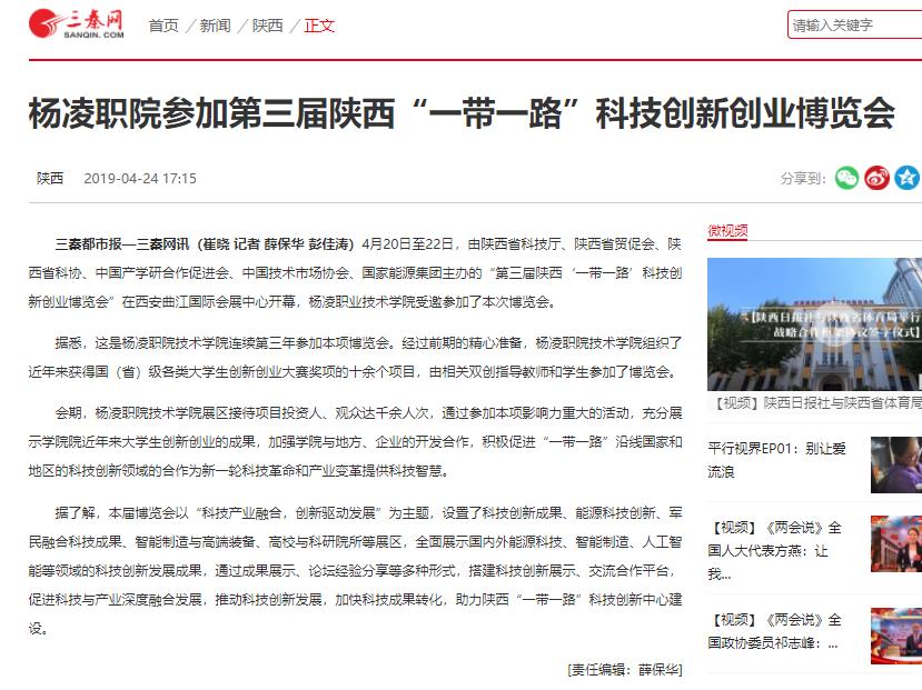 三秦都市报—三秦网讯(崔晓 记者 薛保华 彭佳涛)4月20日至22日,由陕西省科技厅、陕西省贸促会、陕西省科协、中国产学研合作促进会、中国技术市场协会、国家能源集团主办的“第三届陕西‘一带一路’科技创新创业博览会”在西安曲江国际会展中心开幕,杨凌职业技术学院受邀参加了本次博览会。