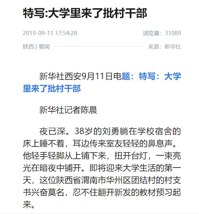 夜已深。38岁的刘勇躺在学校宿舍的床上睡不着,耳边传来室友轻轻的鼻息声。他轻手轻脚从上铺下来,扭开台灯,一束亮光在暗夜中铺开。即将迎来大学生活的第一天,这位陕西省渭南市华州区团结村的村支书兴奋莫名,忍不住翻开新发的教材预习起来。