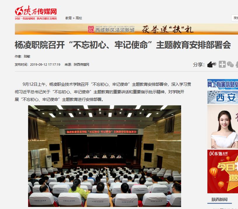 9月12日上午,杨凌职业技术学院召开“不忘初心、牢记使命”主题教育安排部署会,深入学习贯彻习近平总书记关于“不忘初心、牢记使命”主题教育的重要讲话和重要指示批示精神,对学院开展“不忘初心、牢记使命”主题教育进行安排部署。