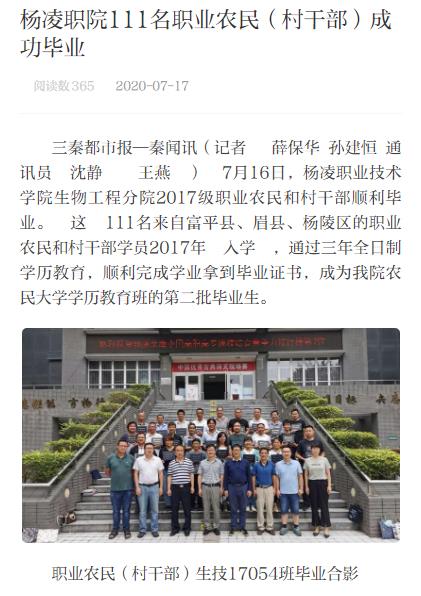 三秦都市报—秦闻讯(记者   薛保华 孙建恒 通讯员  沈静    王燕  )  7月16日,杨凌职业技术学院生物工程分院2017级职业农民和村干部顺利毕业。  这  111名来自富平县、眉县、杨陵区的职业农民和村干部学员2017年  入学  ,通过三年全日制学历教育,顺利完成学业拿到毕业证书,成为我院农民大学学历教育班的第二批毕业生。