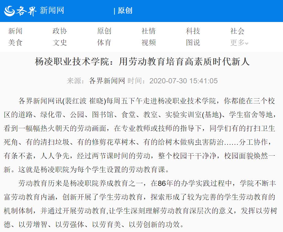 为了深入贯彻落实习近平总书记在全国教育大会上的讲话精神,杨凌职院在总结近年来学生劳动课教育工作成效的基础上,结合学院实际,下发了《杨凌职业技术学院关于进一步加强学生劳动教育的意见》和《杨凌职业技术学院劳动课实施办法(试行)》,并在《办法》中规定,劳动课属于学院“四位一体”人才培养方案中行为养成课范畴,是各专业学生的一门必修课程,与其他课程同向同行,成绩合格方能毕业。