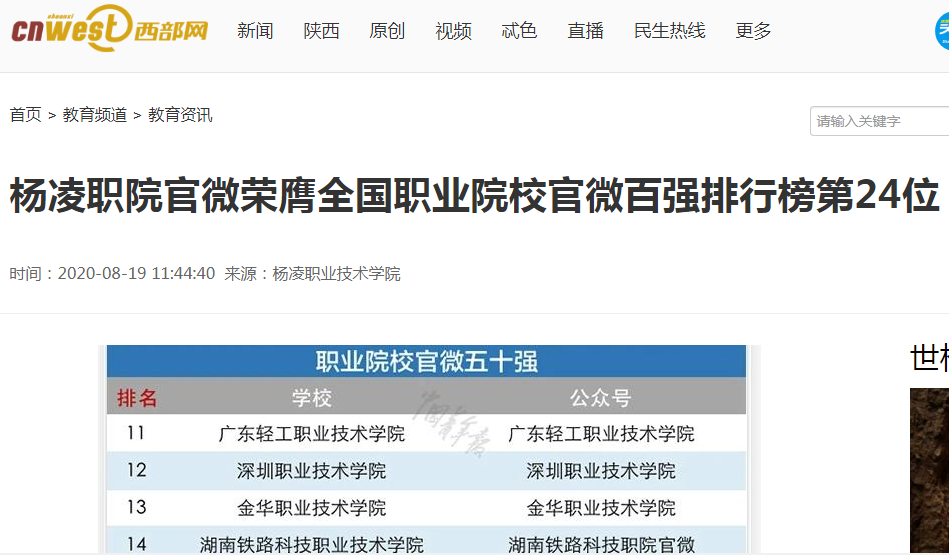 下一条:【三秦都市报】喜讯!杨凌职院官微荣膺全国职业院校官微百强排行榜第24位