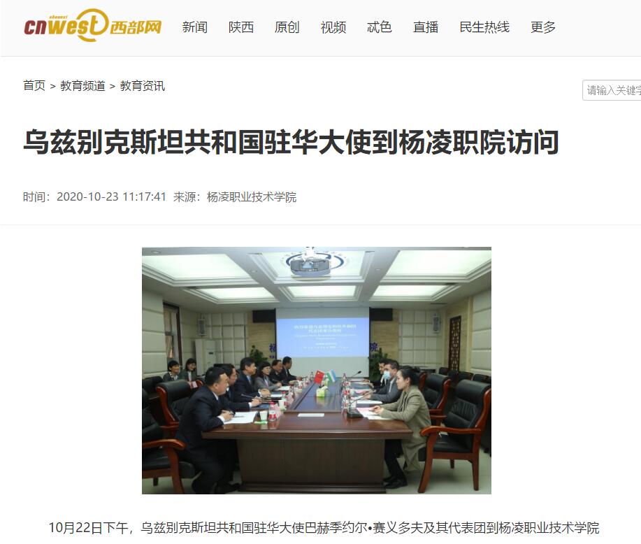 10月22日下午,乌兹别克斯坦共和国驻华大使巴赫季约尔•赛义多夫及其代表团到杨凌职业技术学院访问,校党委书记陈宁、校长王周锁在南校区醒钟楼204会议室接待大使先生一行。乌兹别克斯坦共和国驻华大使馆商务参赞纳吉尔•努尔马托夫、大使助理乌柏都拉耶夫•努尔金、阿瓦兹•卡马洛夫,学校副校长张迪、党委委员、发展规划处处长张宏辉、国际交流处处长杜斌参加了座谈会。座谈会由杨凌职业技术学院副校长张迪主持。