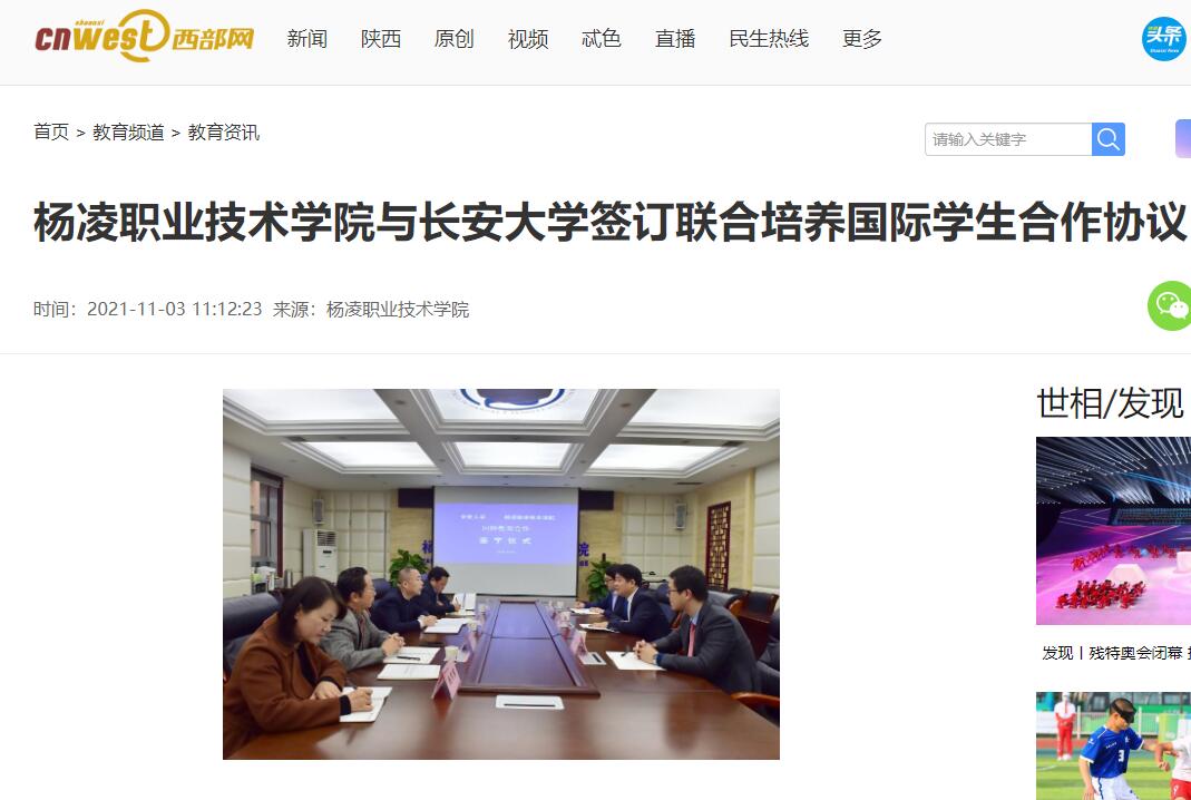 11月2日,杨凌职业技术学院与长安大学联合培养国际学生签约仪式在南校区204会议室举行。仪式举行前,杨凌职业技术学院校长王周锁会见了长安大学国际教育学院领导。长安大学国际教育学院院长张伟、副院长孙林,招生项目主管邢宇航,杨凌职业技术学院副校长胡俊鹏,党委委员、宣传部长裴红波,国际学院院长杜斌、副院长杨雪霁参加签约仪式。