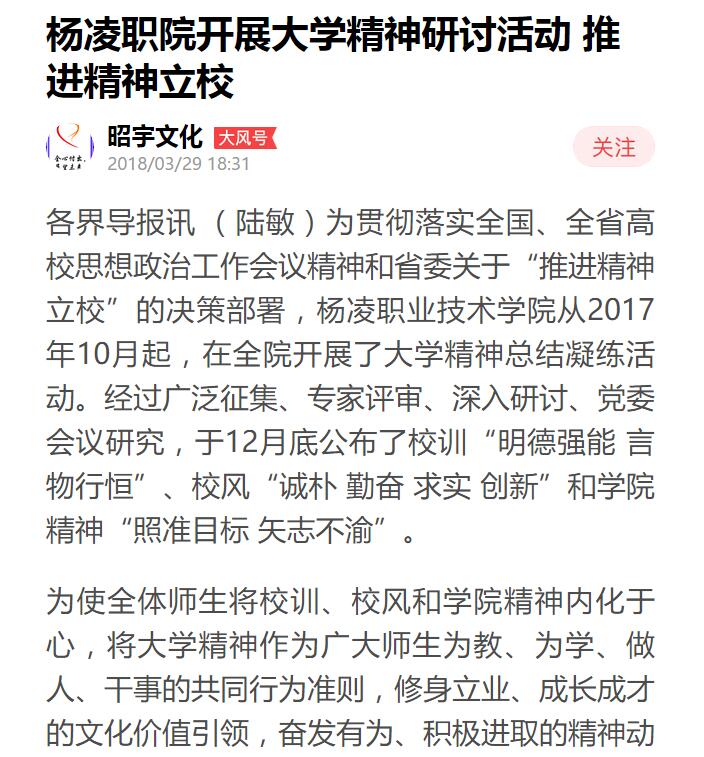 为使全体师生将校训、校风和学院精神内化于心,将大学精神作为广大师生为教、为学、做人、干事的共同行为准则,修身立业、成长成才的文化价值引领,奋发有为、积极进取的精神动力,以及统一思想、凝聚力量、奋力推进学院事业发展的强大文化精神力量,杨凌职院组织师生进行了广泛宣传学习。
