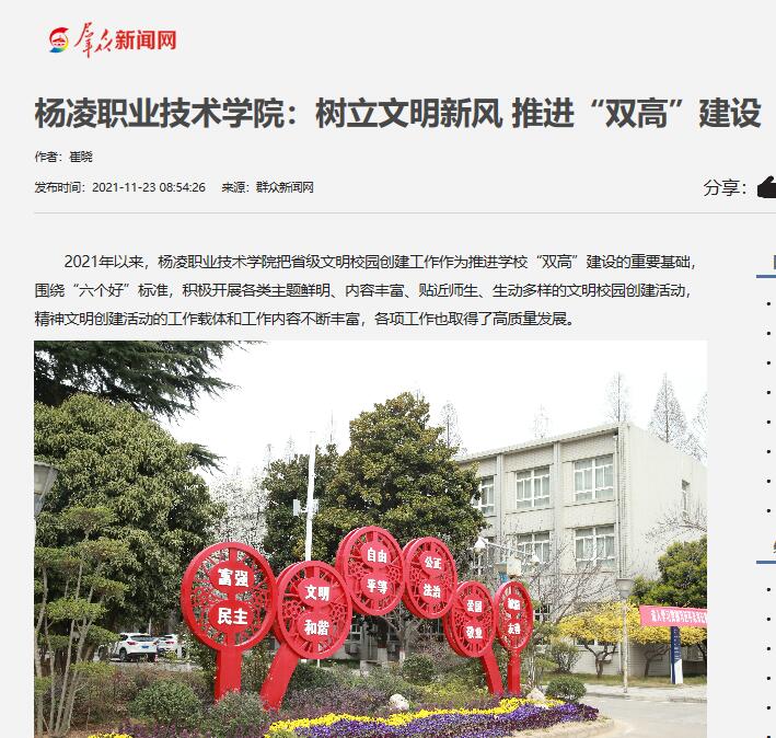 2021年以来,杨凌职业技术学院把省级文明校园创建工作作为推进学校“双高”建设的重要基础,围绕“六个好”标准,积极开展各类主题鲜明、内容丰富、贴近师生、生动多样的文明校园创建活动,精神文明创建活动的工作载体和工作内容不断丰富,各项工作也取得了高质量发展。