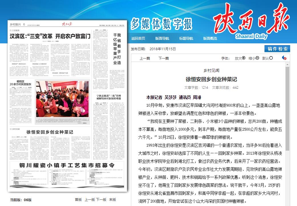 1993年出生的徐恒安是汉滨区吉河镇的一个普通农家娃,当许多90后抢着进入大城市之时,徐恒安却选择了不同的人生——回到家乡种菜。2013年徐恒安从杨凌职业技术学院毕业后到湖北打工,做过农药业务代表,后来开了一家农药经营店。今年初,汉滨区鼓励农户及农民专业合作社大力发展周期短、见效快的高山露地辣椒产业,从种苗、肥料、技术和销路给予一系列政策优惠。听到这个消息,徐恒安坐不住了,他萌生了回到家乡发展绿色蔬菜的想法。说干就干,今年3月,25岁的徐恒安从湖北省宜昌市回到家乡,和高中同学李超一起,在李超的家乡大沟河村,流转了200亩地,开始尝试在这个山大沟深的贫困村种植辣椒。