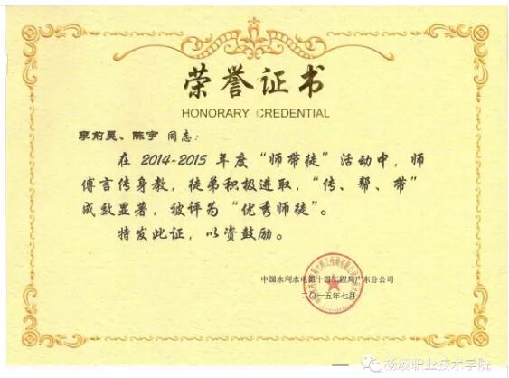 2015年7月,获中国水利水电第十四工程局有限公司广东分公司颁发的二〇一四年度优秀师徒。2015年和2016年,两次获得中国水利水电第十四工程局有限公司华南事业部先进班组称号。